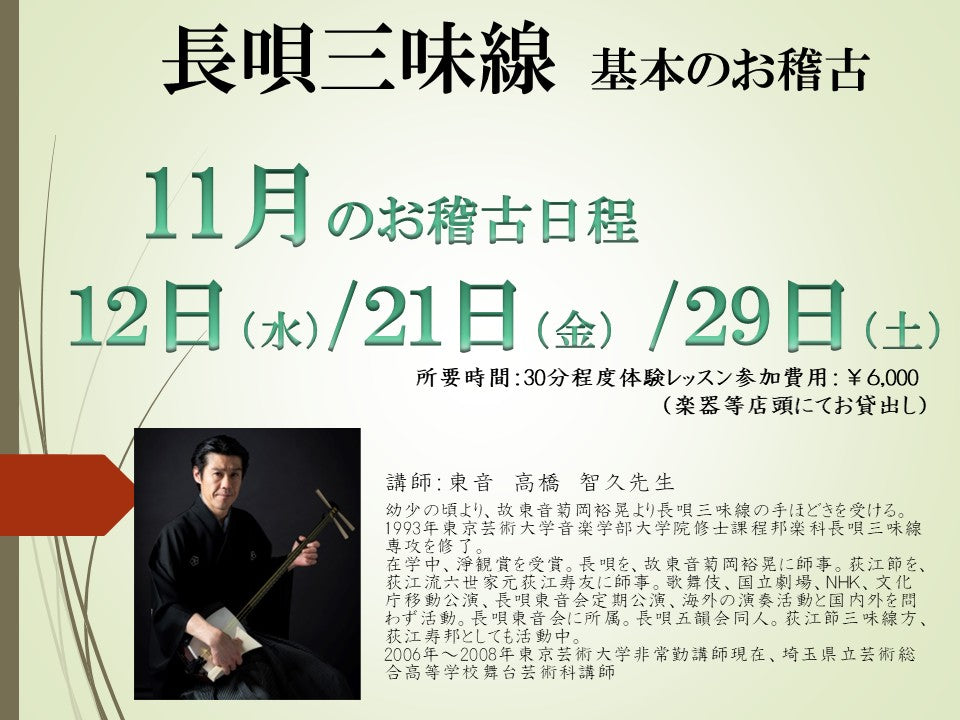 東音会 高橋智久先生による長唄三味線のお稽古を実施しております♪