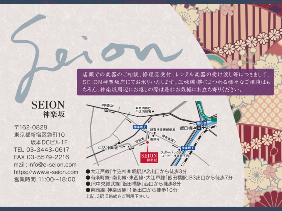 清音(SEION)は三味線の張替え、修理、レンタル、販売・筝(琴)の修理、レンタル、販売を行っている和楽器専門店です。伝統楽器を気軽に楽しく体験して頂くために、邦楽普及の一環としてレンタルやお手頃価格の修理などお客様目線のサービスを展開しております。